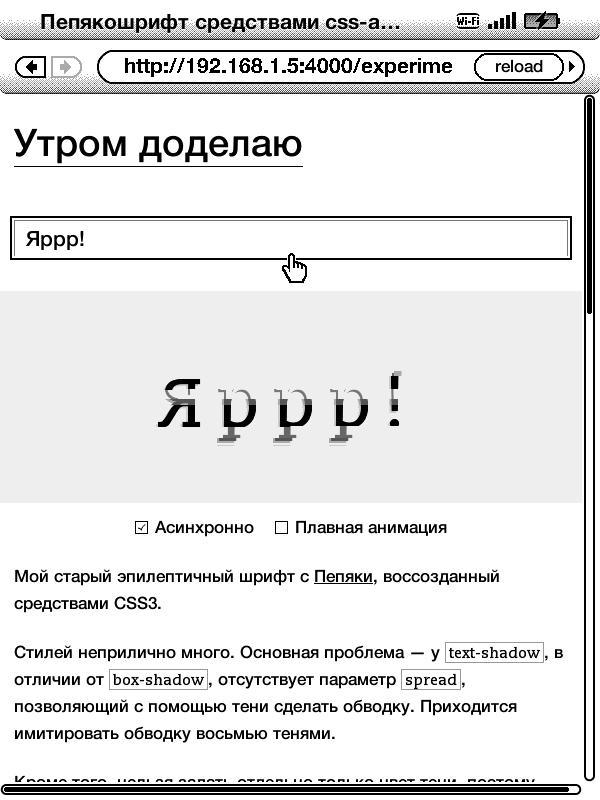 Забавно, что девайс поддерживает анимации и транзишены. Качество анимации на e-ink дисплее полностью передается скриншотом (хотя природа плохой отрисовки анимации на скриншоте — построчное считывание, а на экране — время отклика электронной бумаги):